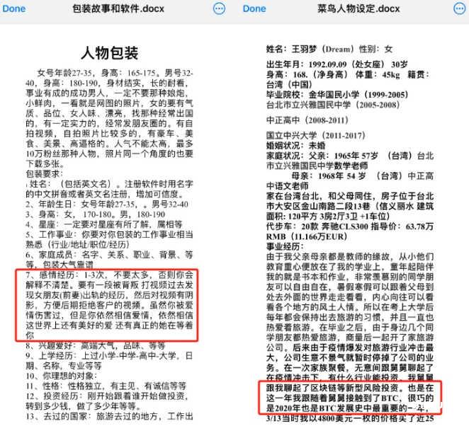 不同社群里几乎都有参考材料,如免费人设、诈骗话术、基础金融知识等。因为多数杀猪盘团伙实施的是金融诈骗投资诈骗,盘哥自己需要大致了解加密币、交易所、钱包等概念和操作。